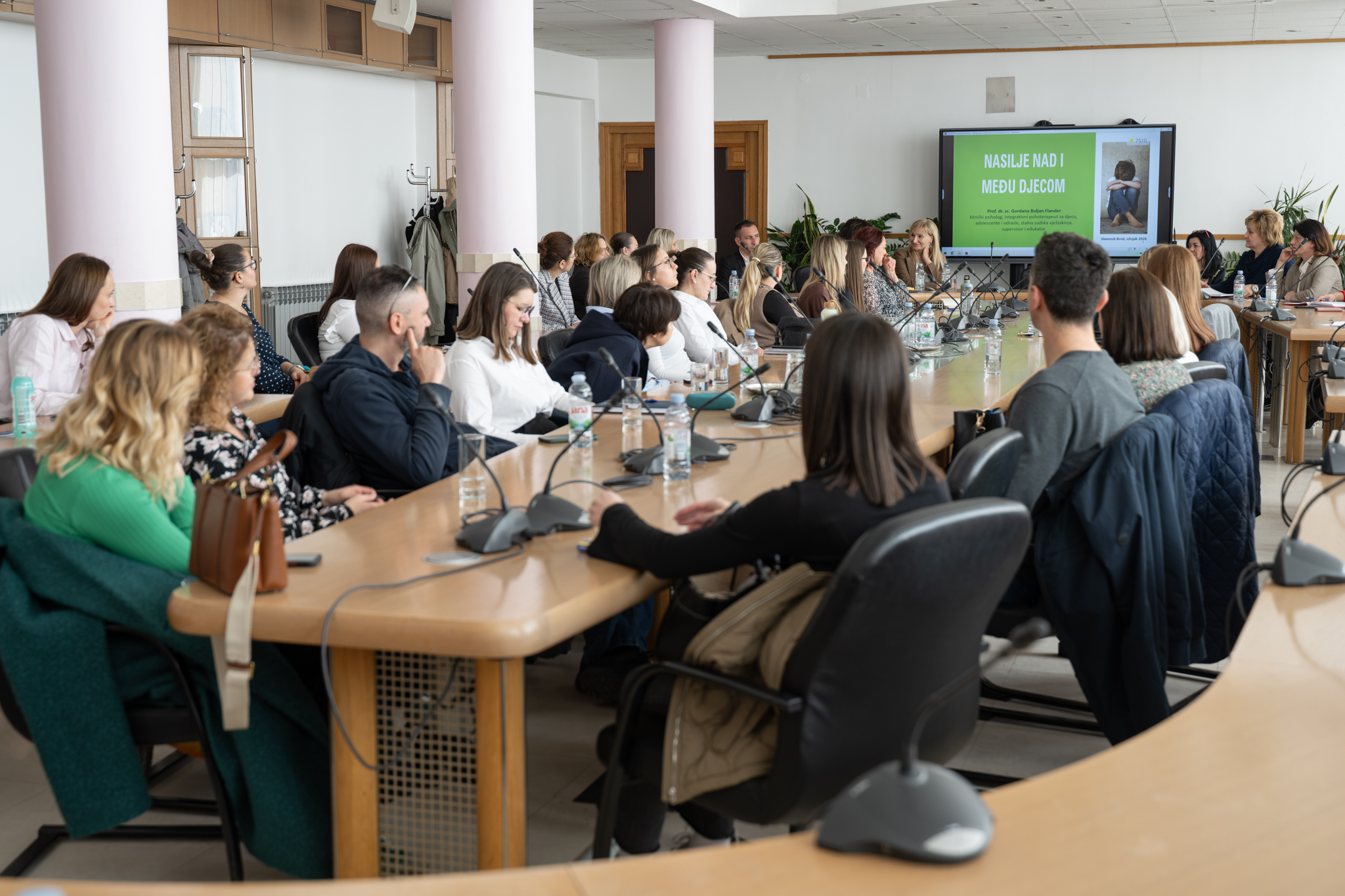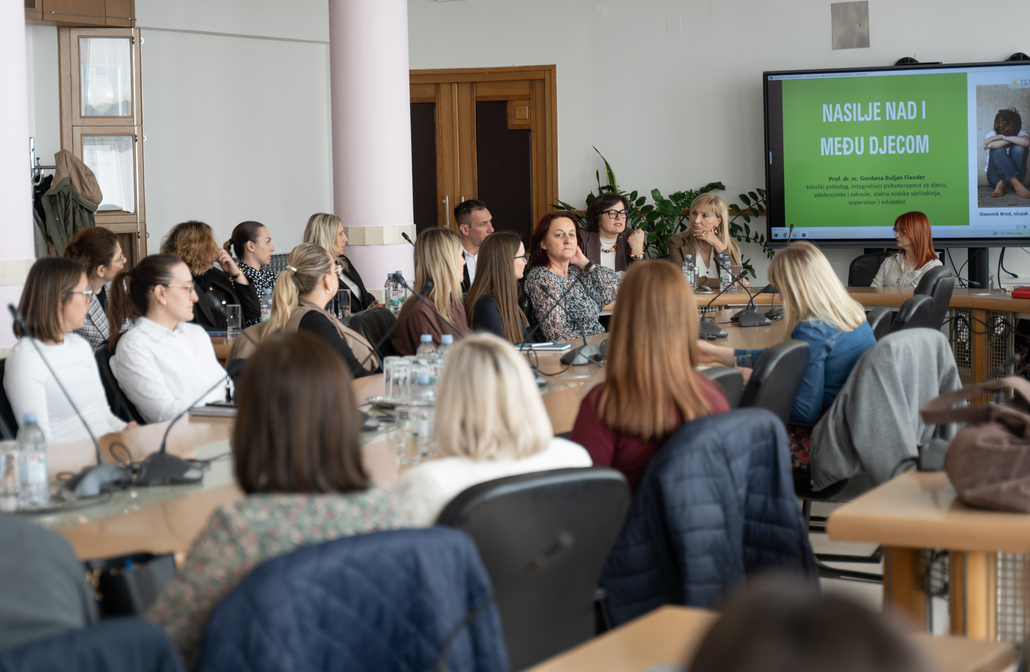 Danas su se okupili u Velikoj vijećnici na stručnom predavanju prof.dr. Gordane Buljan-Flander, kliničke psihologinje i psihoterapeutkinje, integrativne psihoterapeutkinje za djecu, adolescente i odrasle na temu „Djeca, žrtve obiteljskog nasilja“. Istaknula je kako je u čak 50 posto obitelji prisutan neki oblik nasilja. Naglasak je bio na tome kako ga prepoznati i djelovati, te koje su posljedice kontinuiranog zlostavljanja. Prilika je to bila za razmjenu iskustava te međusobno savjetovanje o tome kako postupiti u pojedinim situacijama. Upravo su škole, učitelji, odgojitelji i stručne službe, složili su se, prvi koji bi mogli i trebali prepoznati prve znakove da je dijete izloženo nasilju.