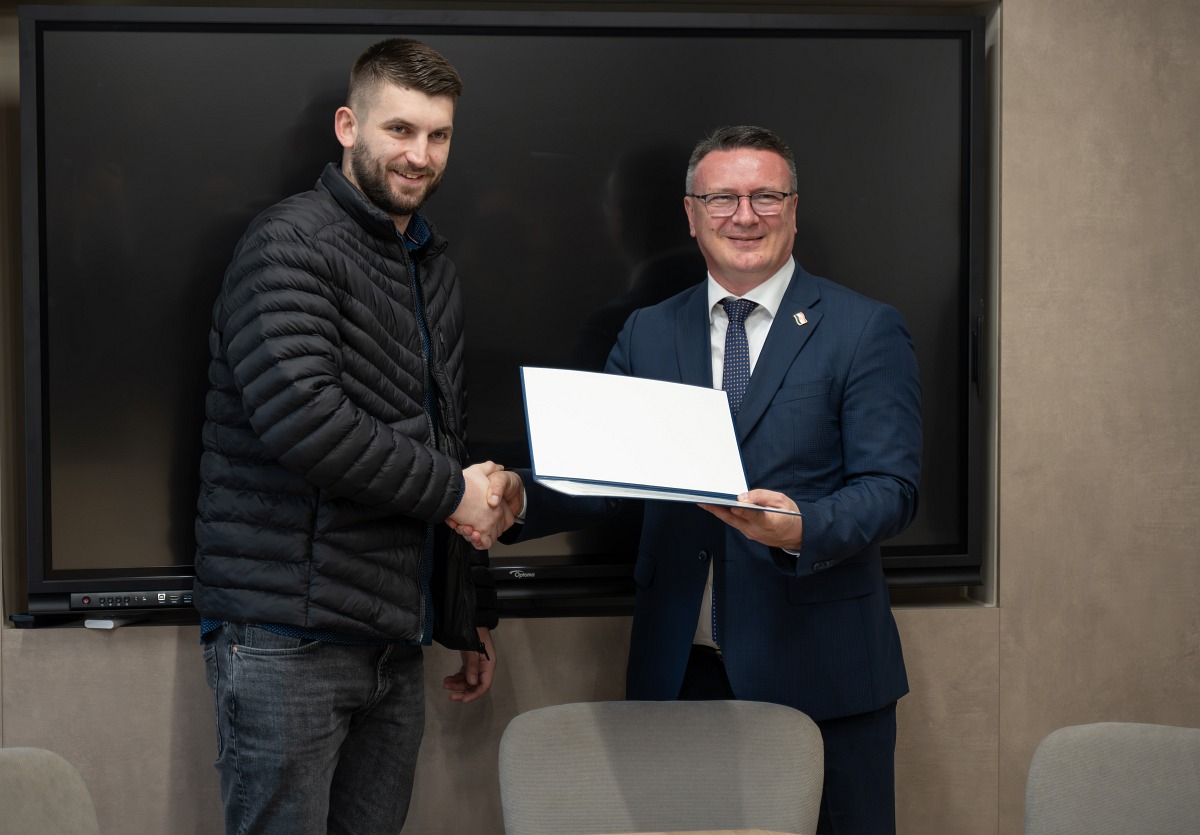 Župan Danijel Marušić sa zamjenikom Markom Šimićem danas je ugostio brončanog Antonija Sekulića. Antonio se s nedavno održanog Europskog prvenstva u futsalu vratio s brončanom medaljom, što je ujedno i prva medalja u povijesti hrvatskoga futsala. Rođen je u Oriovcu, gdje je i započeo svoju nogometnu karijeru. Trenutno igra za Malonogometni klub Osijek.